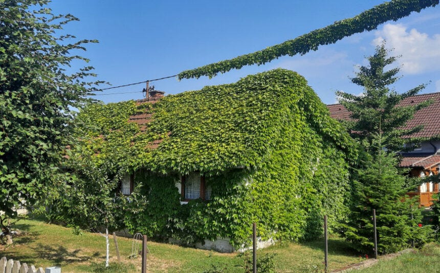 They grew up in this unusual house where no one lives today. They are afraid that when the vines give way, the house will collapse, so they’ve built a new house.
