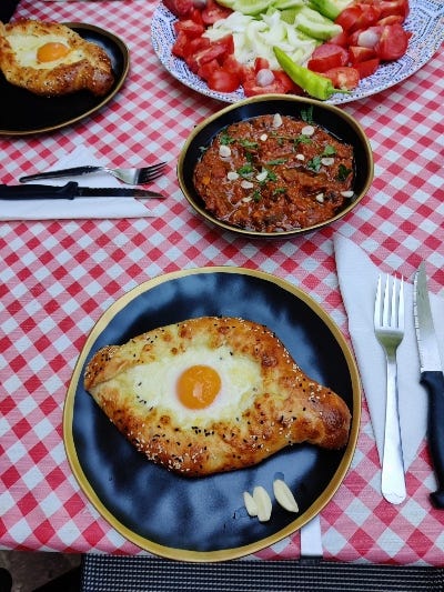 This international lunch of Georgian Khachapuri and Moroccan Zaalouk is a good example. Tamara used ingredients from our garden.