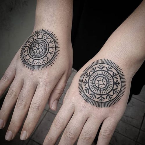 The pattern / pattern would first be drawn with the blunt side of a needle soaked in ink, and only then the #tattoo itself would be drawn, and then the hand would be covered with wax or tissue paper.