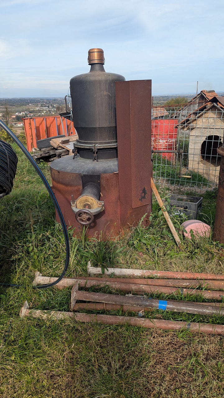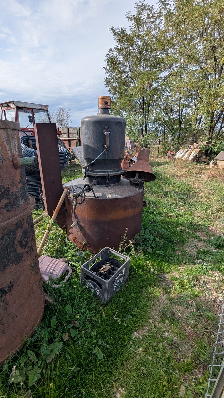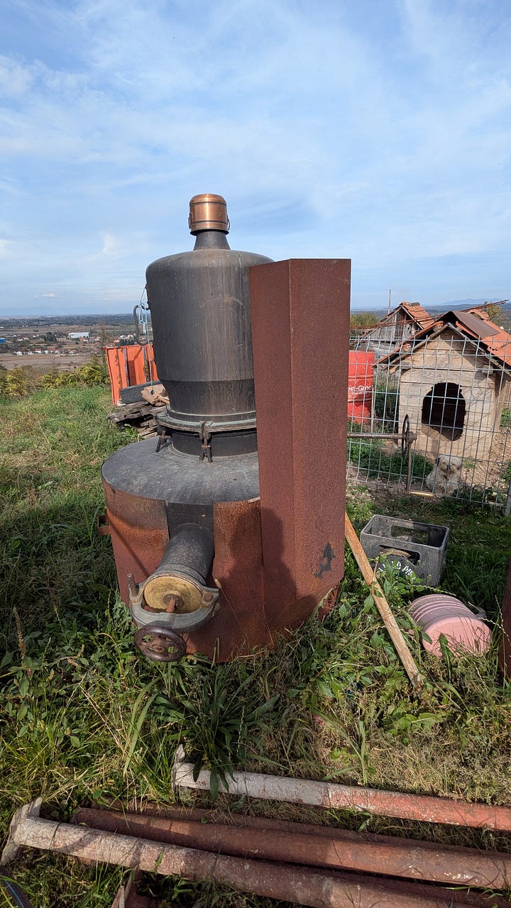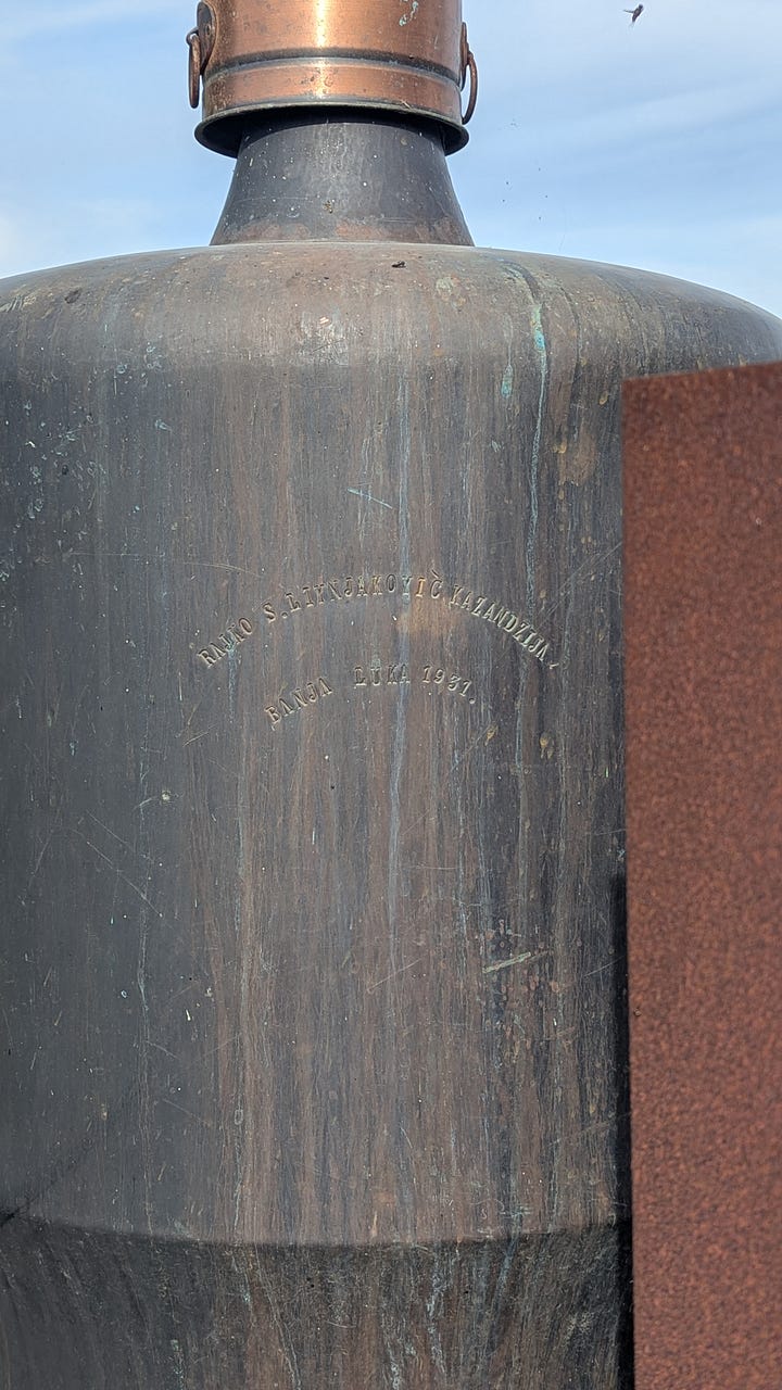 We stopped beside an old rakija still, 1931 stamped on its copper belly.