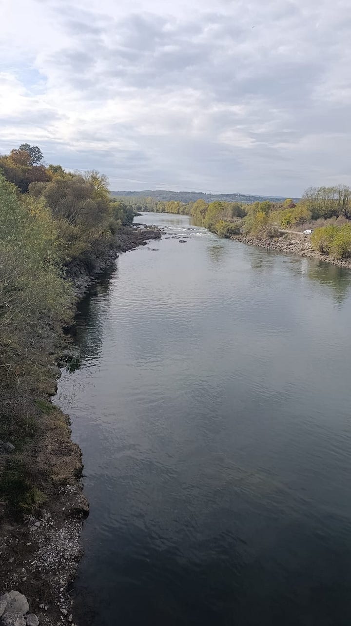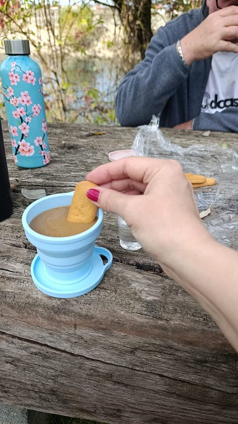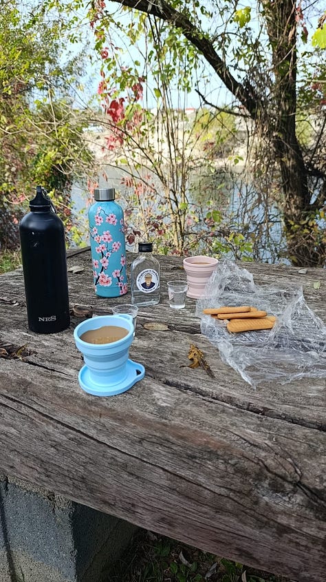 Then onwards downhill to the river bank where we shared some rakija and a thermos of coffee with a few Plazma biscuits. Small rituals, simple pleasures.