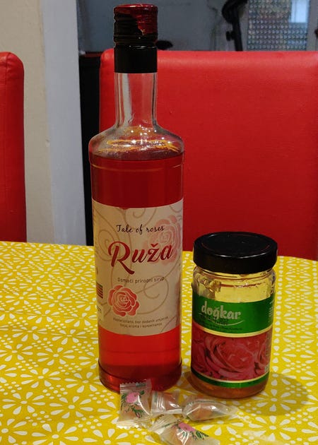 Juice, Rose Jam and Rose flavoured sweets (candies).