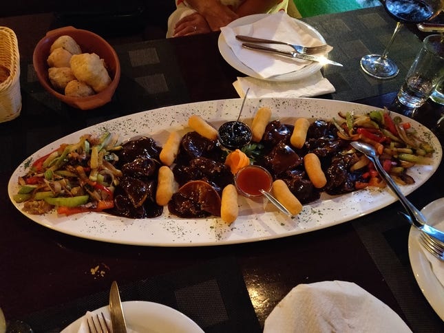 The sample plate was sufficient for us. The meat was an experience (my first time eating bear) and delicious. Croquettes and roasted vegetables accompanied the meat. This restaurant is a must visit when in Banja Luka.
