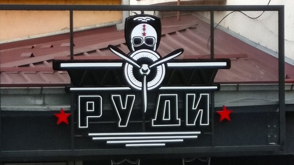 The location had been previously used as Television studios. But when I saw the logo, with the name (in Cyrillic), and the image of an aircraft and the red star, I couldn't help but think of the Jugoslav Partisan fighter pilot, Rudi Čajavec.