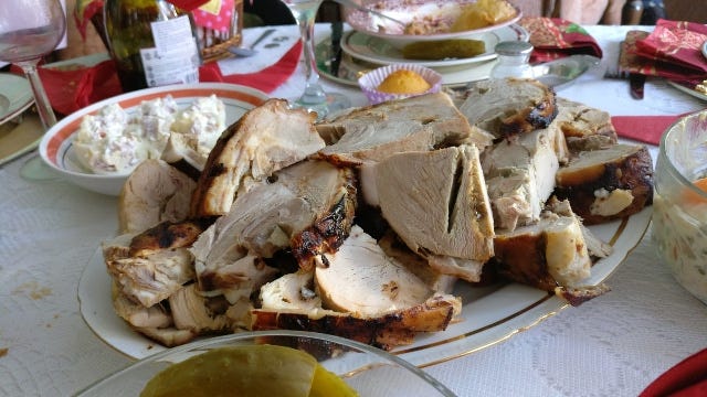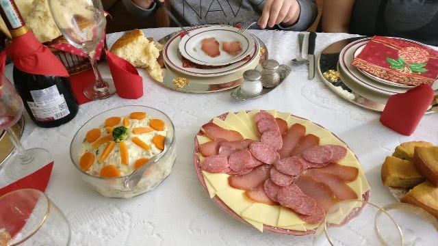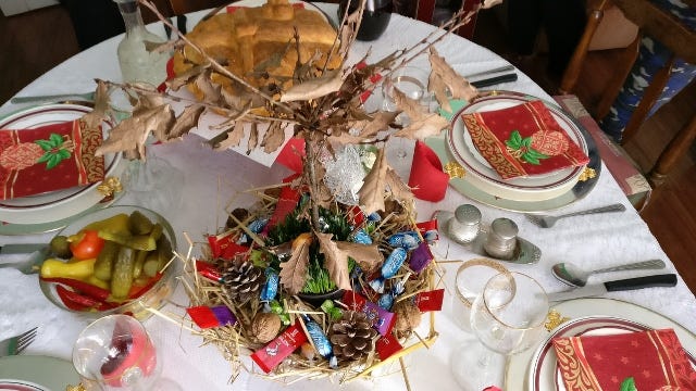 At the beginning of Christmas dinner, the Česnica is rotated three times counterclockwise, before being broken among the family members.