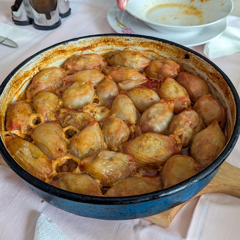 Sogan dolma is onions that are hollowed out, layer by layer, and then stuffed with minced meat, rice, and spices, then slowly cooked in a rich sauce. Preparing it takes patience because each onion has to be softened, the layers separated, filled individually, and then carefully packed into a pot to cook slowly for a long time.