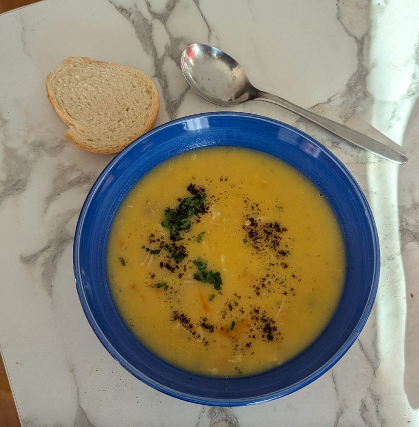 It's a rich and hearty chicken-based soup, thickened with okra and finished with a tangy lemon-egg yolk mixture.