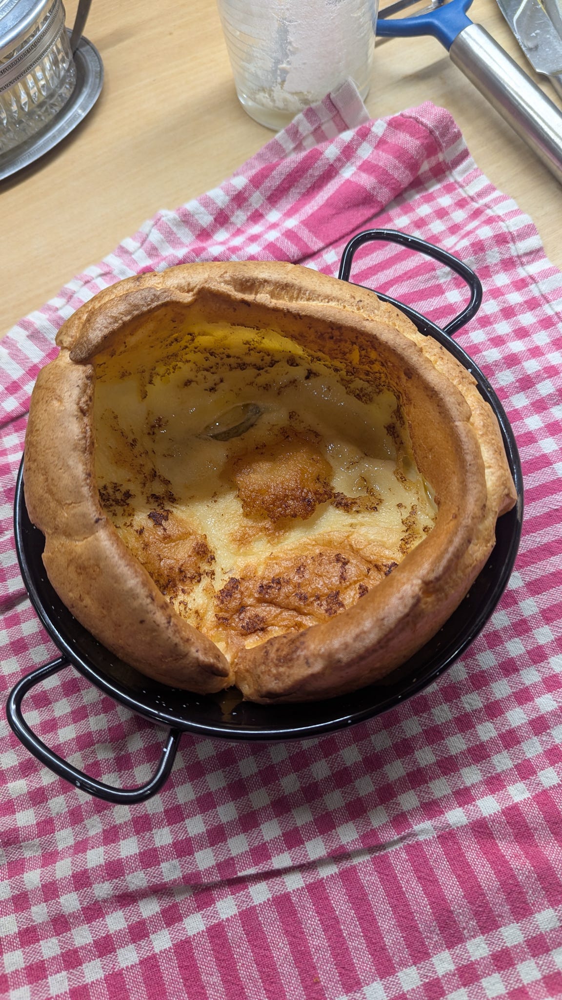 Yorkshire pudding began as a simple batter, flour, eggs, milk, poured into a pan and placed beneath roasting meat to catch the dripping fat. The batter rose in the heat, filling stomachs cheaply and effectively.